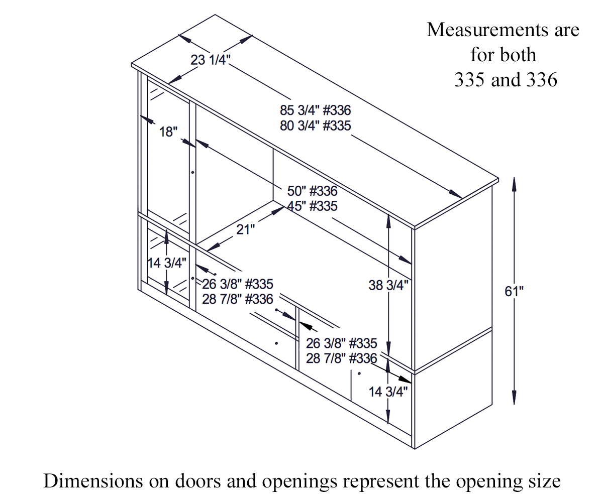 • 336: 85¾”W x 23¼”D x 61″H