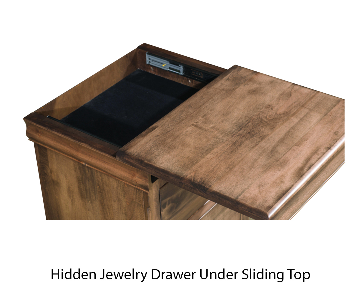 • Hidden jewelry drawer under the sliding top